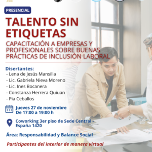 5:00 pm - 7:00 pmCurso Presencial: «TALENTO SIN ETIQUETAS – Capacitación a empresas y profesionales sobre buenas prácticas de inclusión laboral»