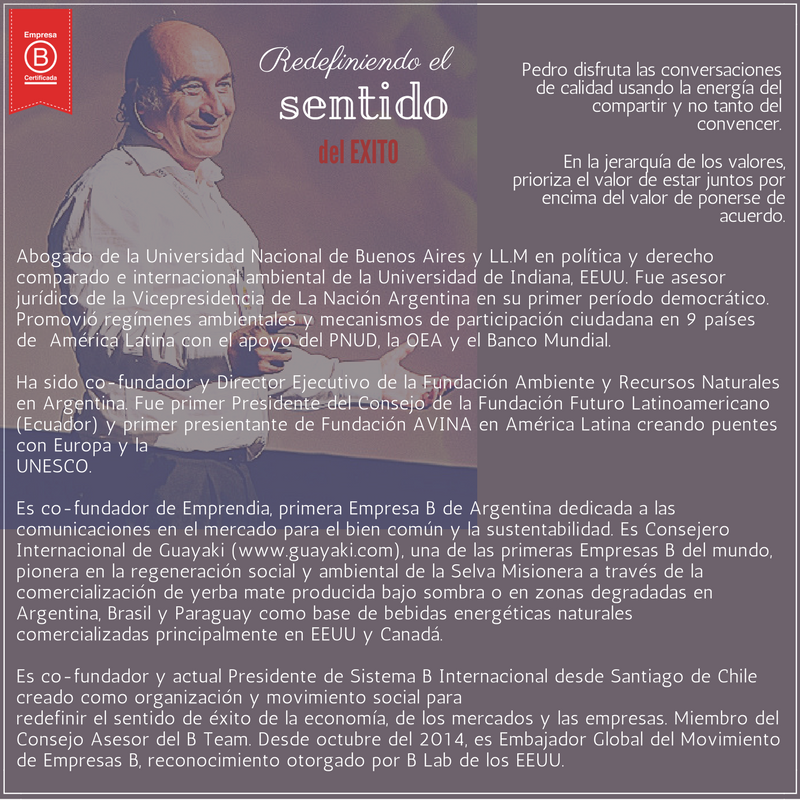Pedro Tarak, es cofundador de Sistema B y Certificate B Corporation. Es organizado por Fundación Manos Abiertas en alianza con las consultoras Comunidad RSE + Be Comunicaciones.