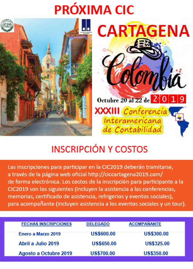 Informamos que nuestra Federación ha conseguido 30 cupos a un precio especial (USD 500) inscribiéndose antes del 31 de mayo a la XXXIII Conferencia Interamericana de Contabilidad que se llevará a cabo del 20 al 22 de octubre de 2019 en Cartagena de Indias, Colombia.