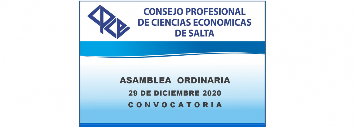 El Consejo Directivo del Consejo Profesional de Ciencias Económicas de Salta, en cumplimiento de las prescripciones legales (art. 30º de la Ley Nº 6.576) convoca a los profesionales matriculados en el Consejo Profesional a Asamblea Ordinaria para el día 29 de Diciembre de 2020 en primera convocatoria a las 19:00 Hs. y en segunda convocatoria a las 20:00 Hs., en la sede de España N° 1.420 de esta ciudad, para considerar el siguiente: