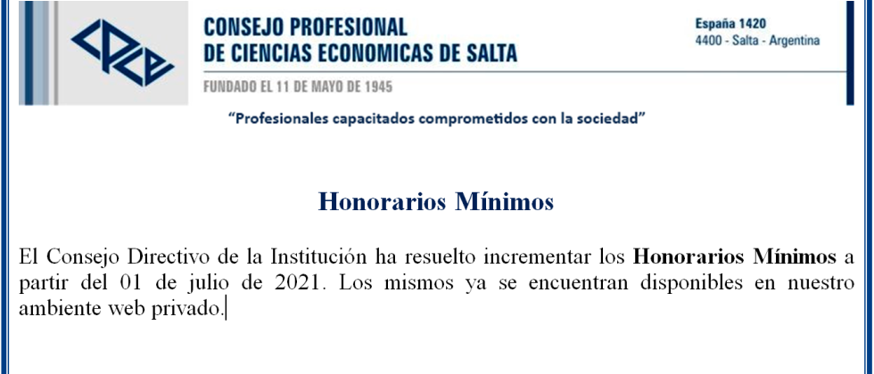 El Consejo Directivo de la Institución ha resuelto incrementar los Honorarios Mínimos a partir del 01 de julio de 2021. Los mismos ya se encuentran disponibles en nuestro ambiente web privado.