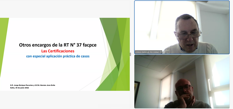 En el día de la fecha se llevó a cabo la capacitación online “Otros encargos de la RT N° 37 FACPCE – La certificación con especial aplicación práctica de casos” a cargo de los Cres. Jorge Enrique PECORINO y Hernán José AVILA.