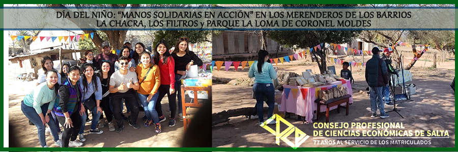 En el marco del día de la infancia, el día domingo 21 de agosto se llevó a cabo la campaña “Manos solidarias en acción”, en los merenderos de los barrios “La Chacra”, “Los Filtros” y “Parque La Loma”, de la localidad Coronel Moldes, la cual estuvo organizada por la Comisión de Jóvenes Profesionales de nuestro Consejo, presidida por la Cra. Tamara Lemos.