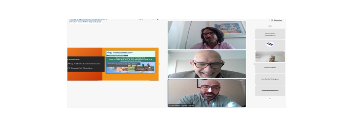 El miércoles 02 de noviembre, se llevó a cabo la capacitación online “Blanqueo de fondos aplicables a la actividad de la construcción”, a cargo de los Dres. Gilberto León SANTAMARÍA y Ricardo CHICOLINO.