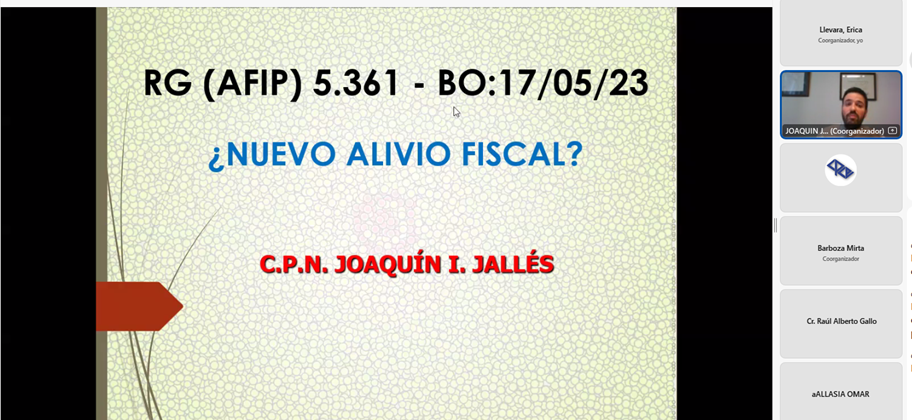 El día de la fecha se llevó a cabo la capacitación online “R. G. 5361 AFIP- ¿Nuevo Alivio Fiscal?, a cargo del Cr. Joaquín Ignacio JALLES.