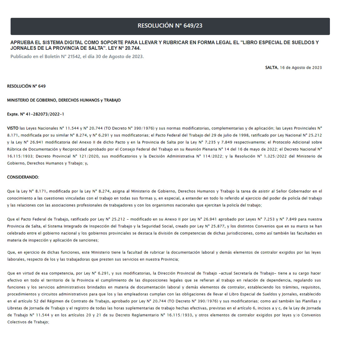 RESOLUCIÓN N° 649/23 DEL MINISTERIO DE GOBIERNO, DERECHOS HUMANOS Y DE TRABAJO