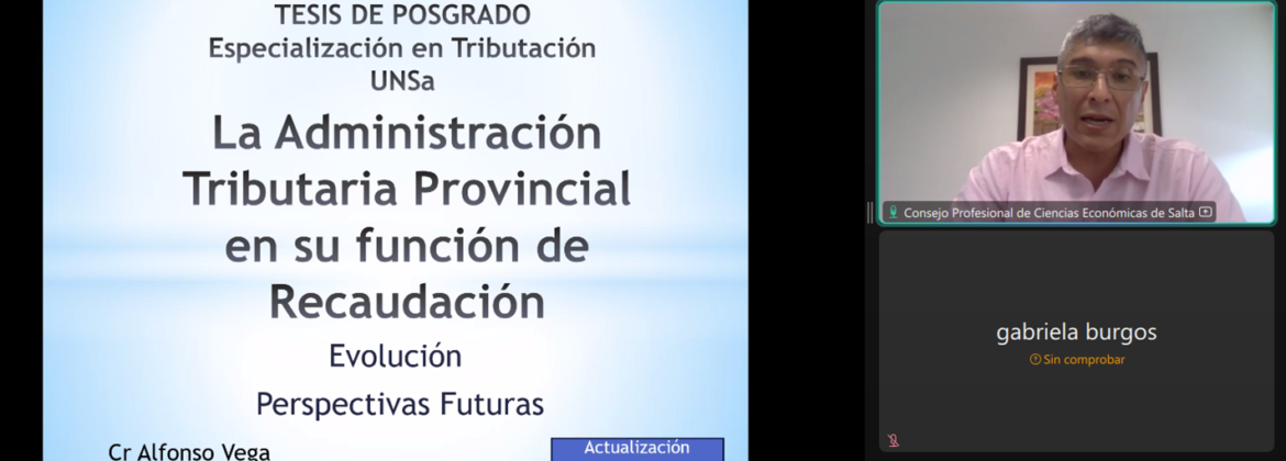 El día de la fecha se llevó a cabo la capacitación online Presentación tesis: “La Administración Tributaria Provincial en su Función de Recaudación- Evolución y perspectivas futuras”, bajo la disertación del Cr. Alfonso VEGA.