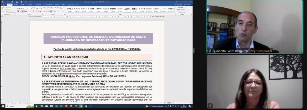 El día de la fecha se llevó a cabo la capacitación online “1ra. Jornada de Novedades Tributarias”, que tuvo como disertantes a la Cra. Patricia Altamirano y el Cr. Humberto Ibarguren.