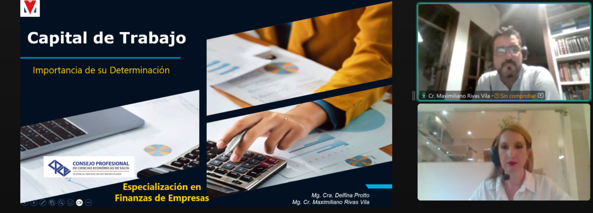 En el marco de la presentación de la carrera “Especialización en Finanzas de Empresas”, modalidad distancia, se llevó a cabo el día de la fecha la charla “Gestión del Capital de Trabajo y Acceso al Sistema Financiero”. La misma estuvo a cargo de la directora de Carrera la Mg. Cra. Delfina PROTTO y el docente Mg. Cr. Maximiliano RIVAS VILAS.