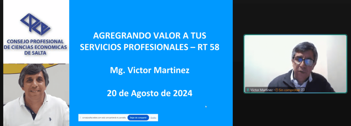 Hoy se llevó a cabo la capacitación online “Agregando valor a tus servicios profesionales - RT 58 de FACPCE”, con la disertación del Lic. Víctor Francisco Martínez, Director General del Consejo Elaborador de Normas de Administración de FACPCE. La sesión fue presentada por la Cra. Patricia Ibañez, vicepresidenta del CPCES.