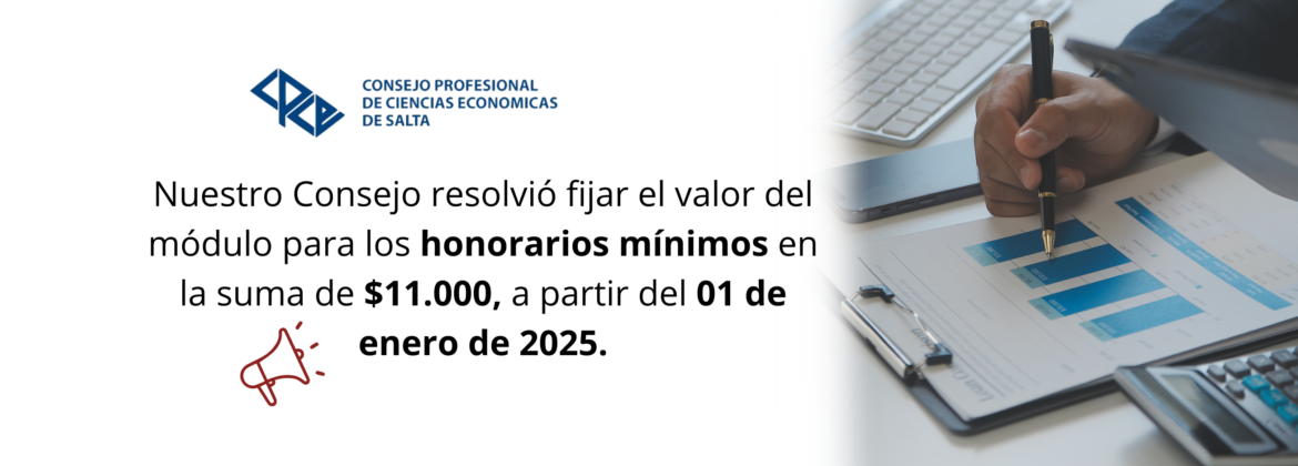 El Consejo Directivo del Consejo Profesional de Ciencias Económicas de Salta resolvió fijar el valor del módulo para los honorarios mínimos en la suma de Pesos Once mil ($11.000).