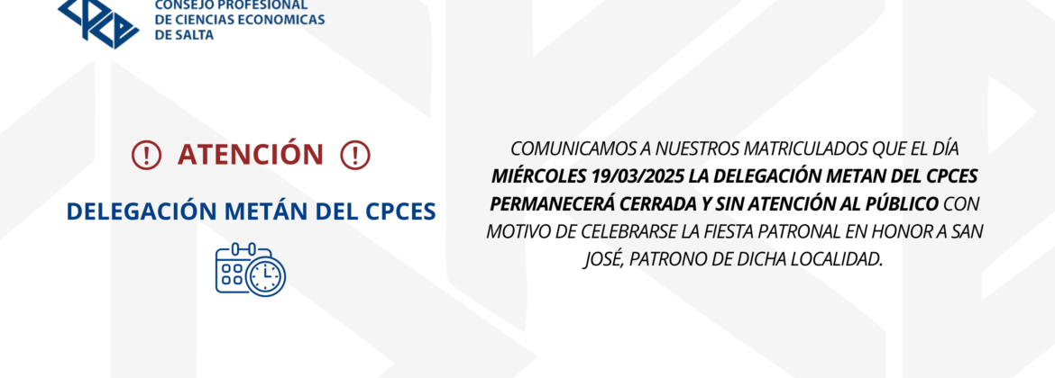 Comunicamos a nuestros matriculados que el día miércoles 19/03/2025 la Delegación Metan del CPCES permanecerá cerrada y sin atención al público con motivo de celebrarse la Fiesta Patronal en honor a San José, patrono de dicha localidad.