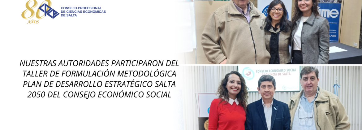 Este 21 y 22 de mayo se llevó adelante en la Cámara de Comercio e Industria de Salta el Taller de Formulación Metodológica Plan de Desarrollo Estratégico Salta 2050 del Consejo Económico Social, con representación del CPCES, a través de su presidente, Cr. Néstor Daniel Cáseres; vicepresidenta 1ra, Cra. Patricia Ibáñez, consejera, Cra. Romina Chanampa, y el profesor César Moreno, entre otros matriculados.