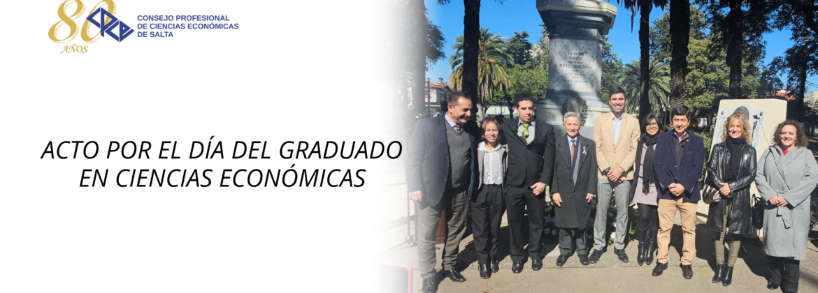Se llevó a cabo en horas de la mañana, el acto por el Día del Graduado en Ciencias Económicas, con la participación de las autoridades del Consejo Profesional de Ciencias Económicas de Salta: Cr. Néstor Daniel Cáseres, presidente; Cra. Patricia Ibáñez, vicepresidenta 1ra; Cr. Federico Martín Peralta Lesser; coordinador general, y la Cra. Miriam Beltrán. También participaron autoridades de la Universidad Nacional de Salta, Cr. Alberto Mariscal, secretario general de Rectorado, la Lic. Teodelina Zuviría, decana de la Facultad de Ciencias Económicas, Jurídicas y Sociales; la Cra. Alejandra Navas, vicedecana y consejera de nuestra institución, y el Cr. /Lic. Fernando Echazú, secretario de Asuntos Institucionales y Administrativos de la Facultad de Ciencias Económicas, Jurídicas y Sociales, de esa casa de altos estudios.