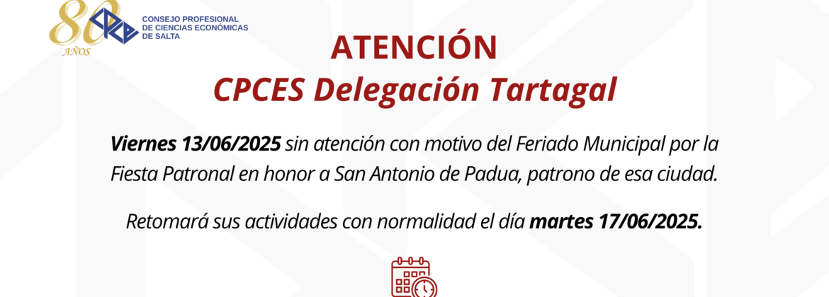 Informamos a los matriculados que el día viernes 13/06/2025 la Delegación Tartagal permanecerá sin atención con motivo del Feriado Municipal por la Fiesta Patronal en honor a San Antonio de Padua, patrono de esa ciudad.