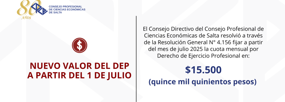 El Consejo Directivo del Consejo Profesional de Ciencias Económicas de Salta resolvió a través de la Resolución General N° 4.156 fijar a partir del mes de julio 2025 la cuota mensual por Derecho de Ejercicio Profesional en Pesos quince mil quinientos ($15.500) conforme el siguiente detalle: