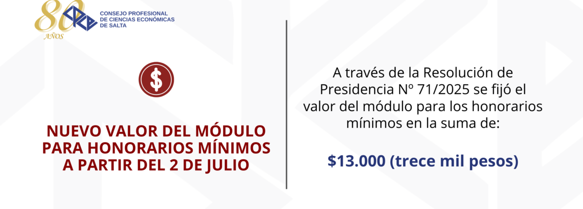 A través de la Resolución de Presidencia Nº 71/2025 se fijó el valor del módulo para los honorarios mínimos en la suma de Pesos trece mil ($13.000).
