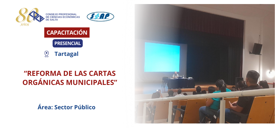 En el marco de las actividades realizadas en conmemoración del 101 aniversario de la fundación de la Ciudad de Tartagal el viernes 26 y sábado 27 de septiembre, se llevó a cabo de manera presencial en el Centro Cultural de dicha ciudad, la capacitación “Reforma de las Cartas Orgánicas Municipales”, bajo la disertación del Cr. Sergio Gastón Moreno.