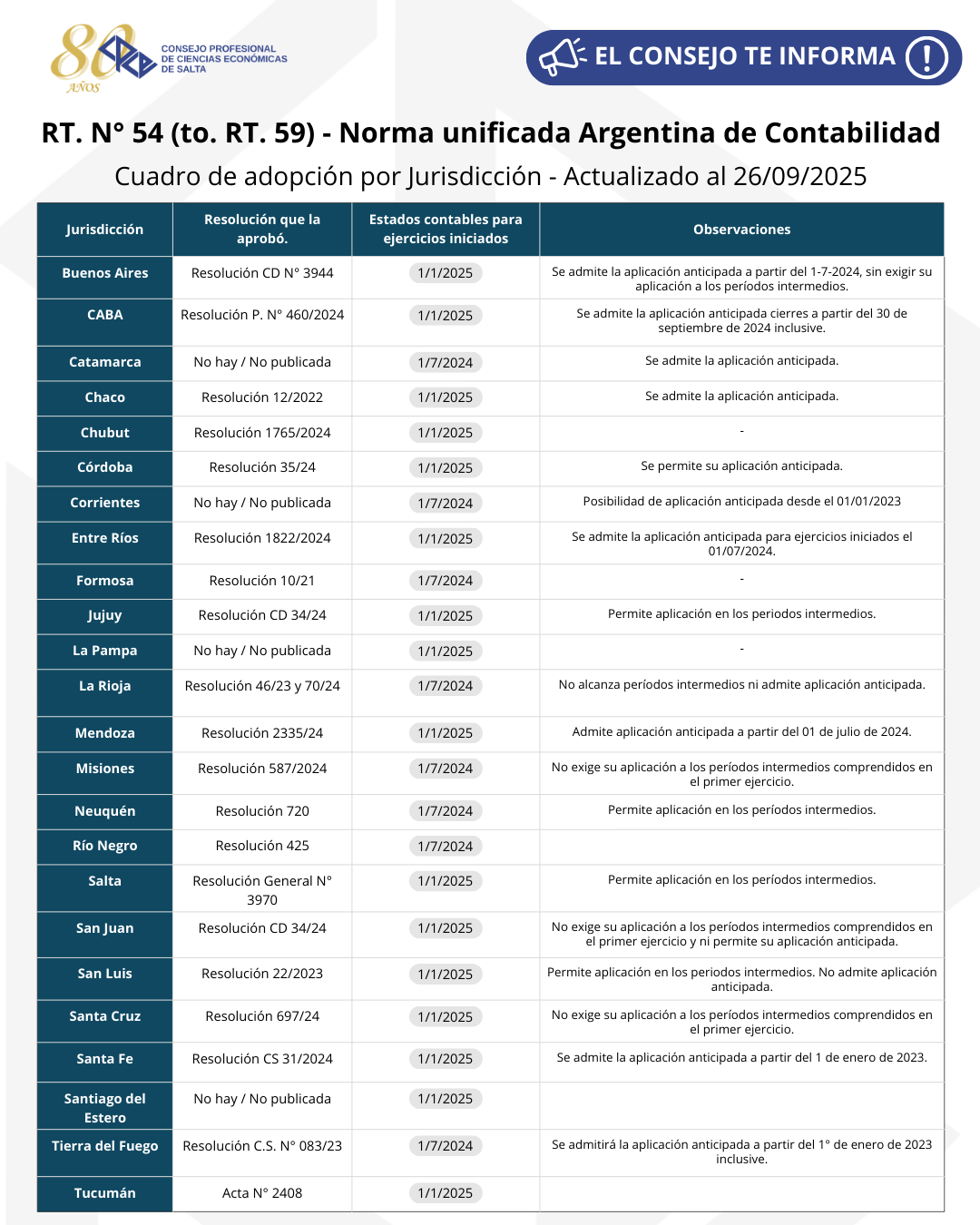 EL CONSEJO TE INFORMA: RT. N° 54 (to. RT. 59) – Norma unificada Argentina de Contabilidad – Cuadro de adopción por Jurisdicción – Actualizado al 26/09/2025