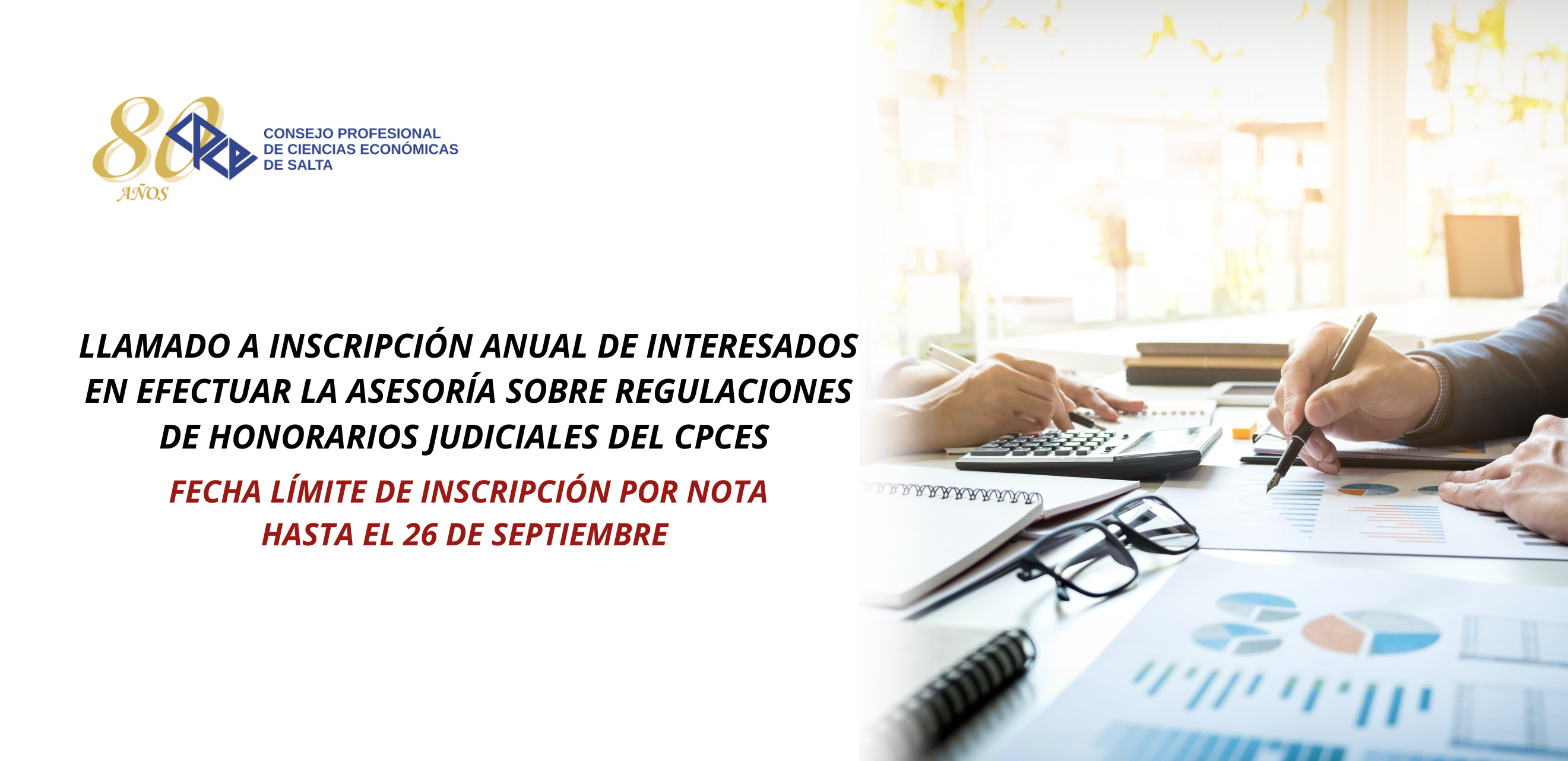 A través de la Resolución de Presidencia N° 83, se efectuó llamado a inscripción anual de interesados en efectuar la asesoría sobre regulaciones de honorarios judiciales del Consejo Profesional de Ciencias Económicas de Salta, debiendo observarse lo establecido en el Anexo I de la Resolución General N° 3.485, para el período 01/10/2025 al 30/09/2026.