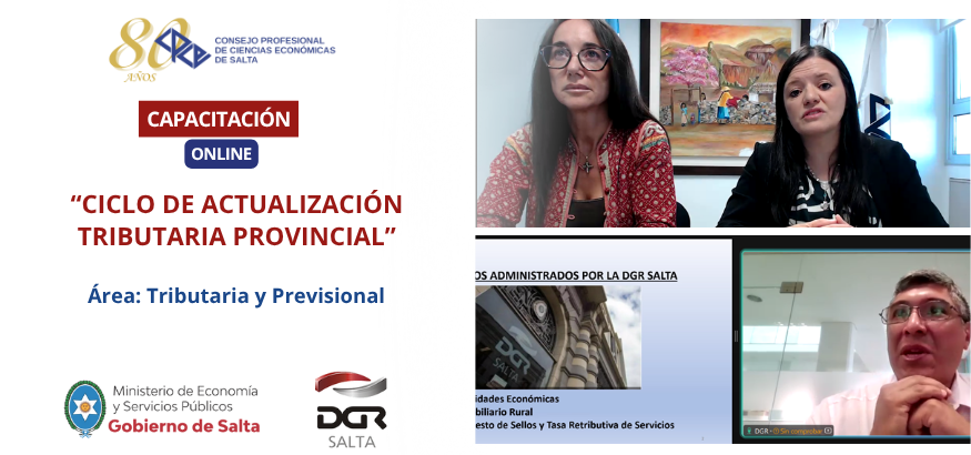 En el día de la fecha, se llevó a cabo de manera online el segundo encuentro del Ciclo de Actualización Tributaria Provincial. La jornada estuvo encabezada por la Cra. María Soledad Claros, Secretaria de Ingresos Públicos; la Cra. María Mercedes Uldry Fuentes, Directora General de Rentas de Salta; y el Cr. Alfonso Jorge Antonio Vega, Supervisor del Centro de Atención al Contribuyente de la DGR.
