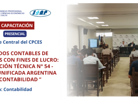 El miércoles 24 de septiembre se llevó a cabo la capacitación presencial “Estados Contables de Entidades con Fines de Lucro: Resolución Técnica N° 54 – Norma Unificada Argentina de Contabilidad”, bajo la disertación del Cr. Carlos Darío Torres y Cr. Hugo Marcelo Nazar.