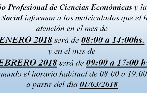 El Consejo Profesional de Ciencias Económicas de Salta y la Caja de Seguridad Social del CPCES, informan los horarios de atención para los meses de Enero y Febrero 2.018
