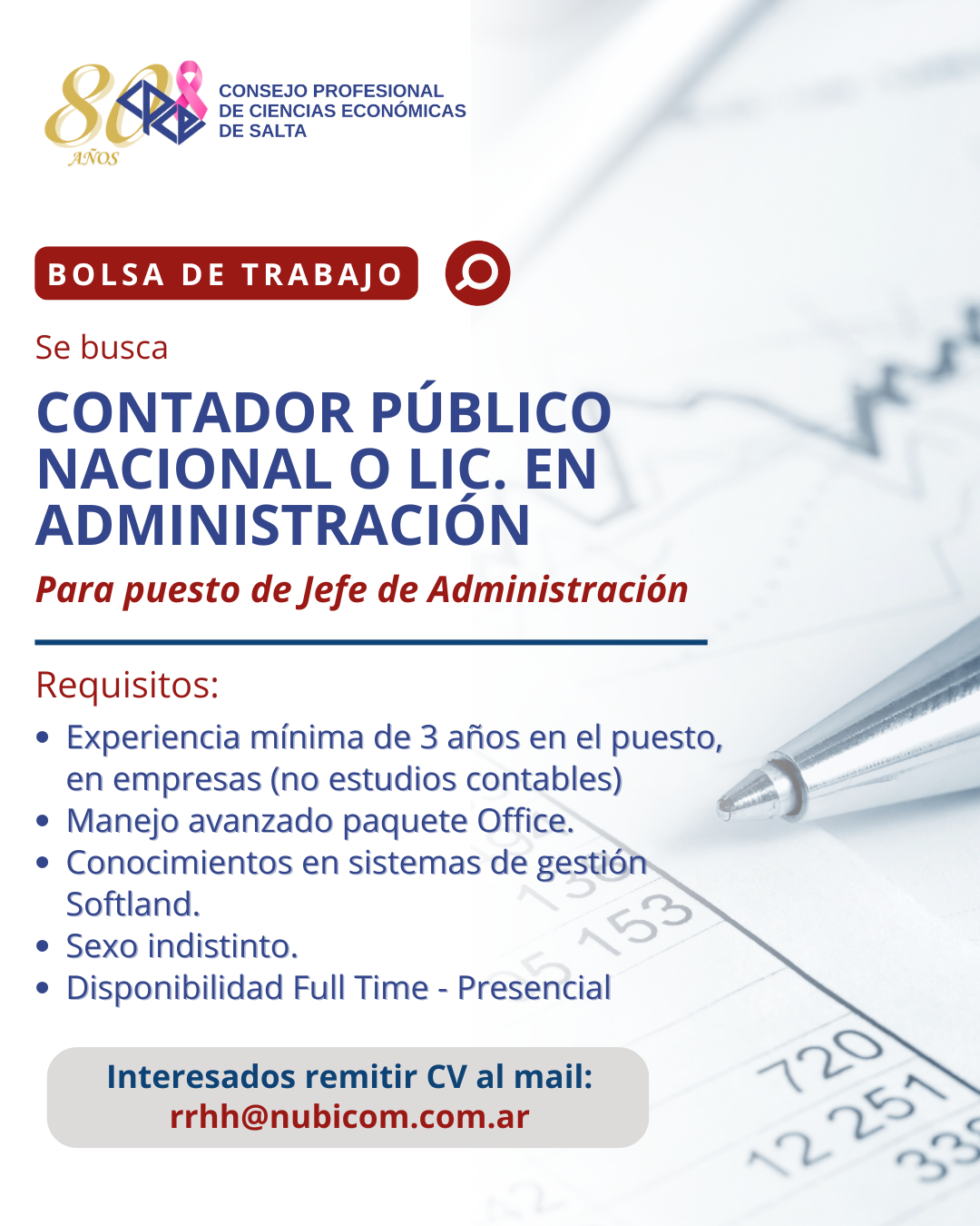 |  | 📣 NUEVA BÚSQUEDA LABORAL: 👉👉 CONTADOR PÚBLICO, LIC. EN ADMINISTRACIÓN O CARRERAS AFINES Requisitos: Responsabilidades: 📧Interesados enviar currículum vitae al correo: rrhh@nubicom.com.ar | |