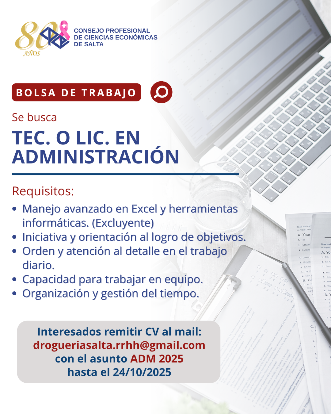 |  | 📣 NUEVA BÚSQUEDA LABORAL: 👉 TÉC. O LIC. EN ADMINISTRACIÓN Aspectos a tener en cuenta: -Una cultura simple, honesta y cercana. 📧Interesados enviar currículum vitae al correo: drogueriasalta.rrhh@gmail.com REF: ADM 2025 hasta el 24/10/2025. Indicar remuneración pretendida. 👉 Agradecemos al Cr. Franco Tapia por confiar en nosotros para dar a conocer esta convocatoria. | |