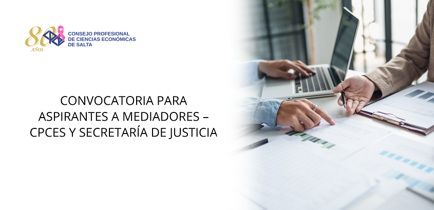 El Consejo Profesional de Ciencias Económicas de Salta (CPCES), en conjunto con la Secretaría de Justicia, invita a los profesionales en Ciencias Económicas del interior de la provincia a postularse como aspirantes a mediadores dentro del marco del Convenio de Colaboración vigente, hasta el 31 de octubre de 2025. - Para formar parte de este programa, [...]