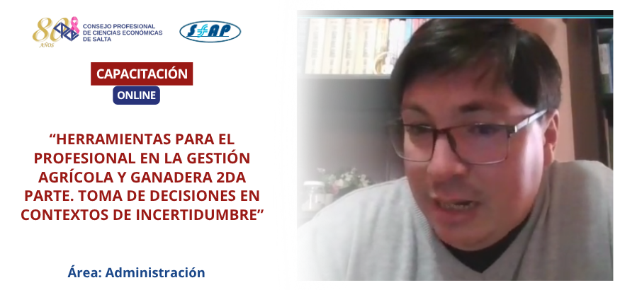 El día de la fecha dio inicio la capacitación online “Herramientas para el profesional en la gestión agrícola y ganadera 2da parte. Toma de decisiones en contextos de incertidumbre”, bajo la disertación del Cr. Juan Pablo Galli. La actividad se desarrollará en dos jornadas continuando el lunes 13 de octubre por la tarde.