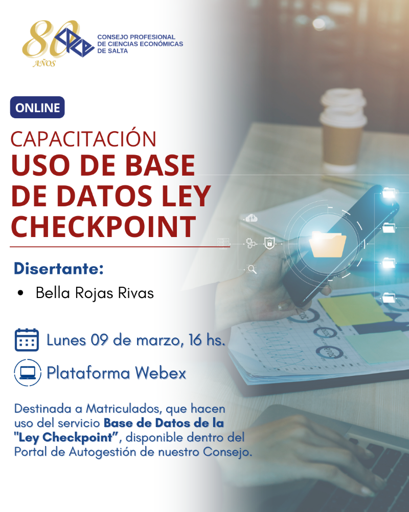 Capacitación destinada a los Matriculados sobre el uso del servicio Base de Datos de la "Ley Checkpoint", disponible dentro del portal de Autogestión del Consejo Profesional de Ciencias Económicas de Salta.