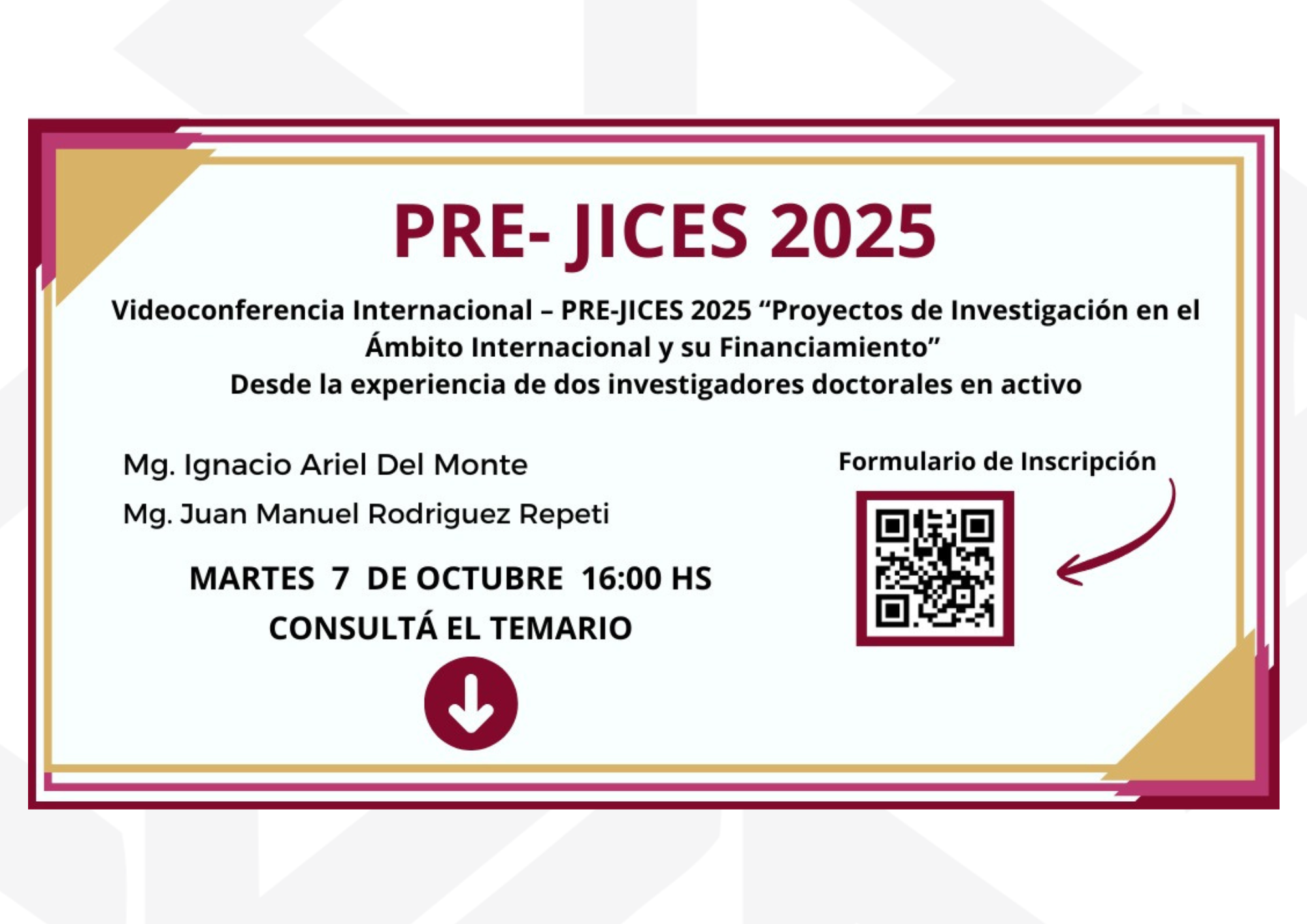 VIDEOCONFERENCIA INTERNACIONAL – PRE-JICES 2025 – “PROYECTOS DE INVESTIGACIÓN EN EL ÁMBITO INTERNACIONAL Y SU FINANCIAMIENTO